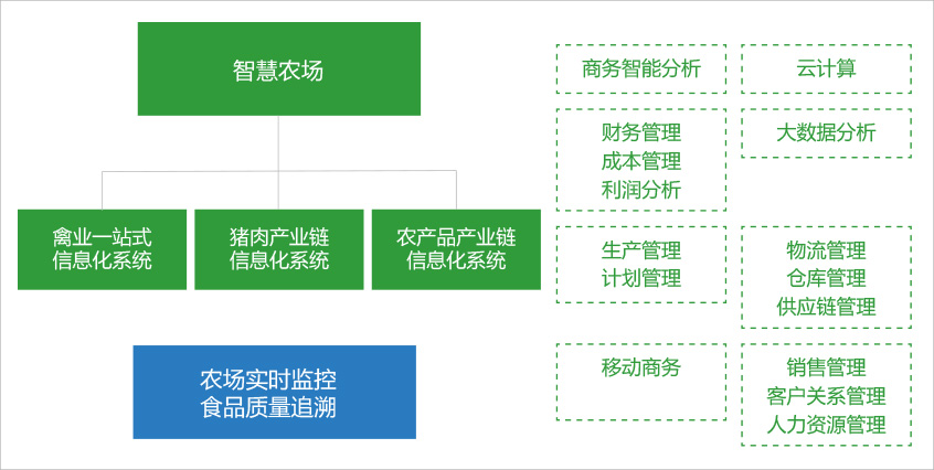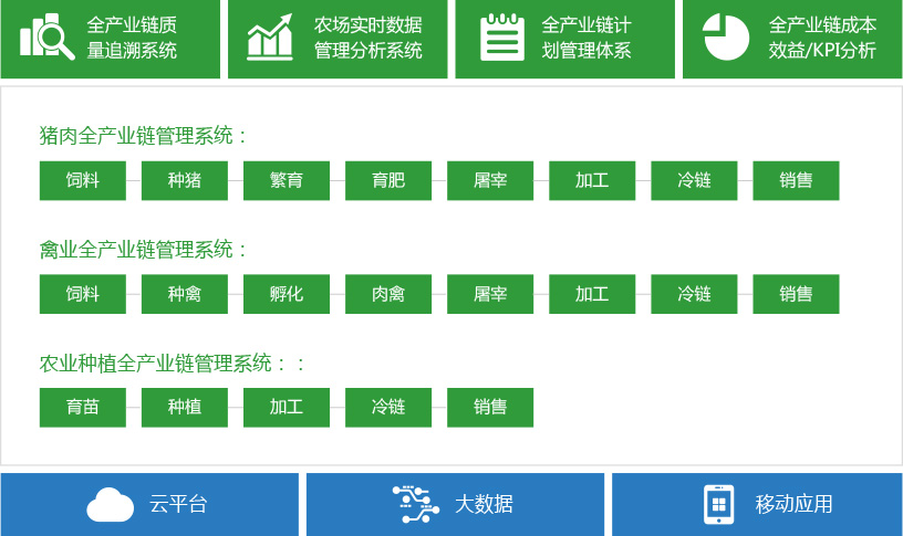 通過系統農場到餐桌的應用,可將種植場、養殖場(自養或合同戶)、屠宰廠、食品深加工廠、冷鏈物流、配送和銷售等業務環節全部納入實時管理、監控和大數據分析系統。企業管理者無需待在監控室就能通過電腦、手機或移動終端實時掌握業務運營現狀,了解現場養殖、動保、環控、防疫等信息,屠宰、加工的生產效率與質量一目了然,市場價格和銷售報告實時獲取。
