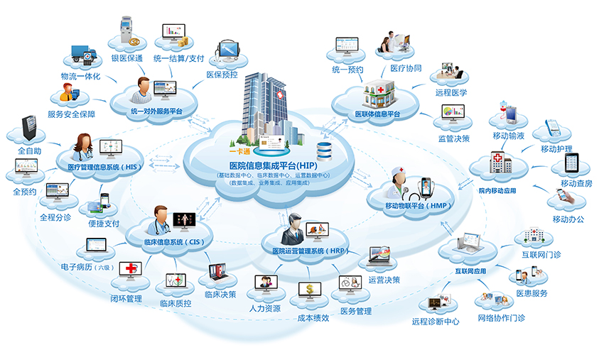 智慧醫療是以醫療數據中心為核心,以電子病歷、居民健康檔案為基礎,以自動化、信息化、智能化為表現,綜合應用物聯網、頻射技術、嵌入式無線傳感器、云計算等信息技術,構建高效化的信息支撐體系、規范化的信息標準體系、常態化的信息安全體系、科學化的政府管理體系、專業化的業務應用體系、便捷化的醫療服務體系、人性化的健康管理體系,使得整個醫療生態圈中的每一個群體均可從中受益。